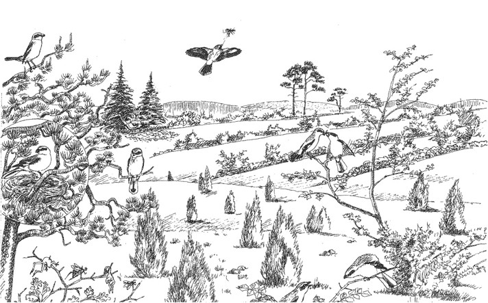 Der Raubwürger gilt als Leitart halboffener Kulturlandschaften. Schutzmaßnahmen für ihn fördern zugleich viele weitere Arten, etwa Neuntöter, Braunkehlchen, Wiesenpieper, Schmetterlinge und Wildbienen.